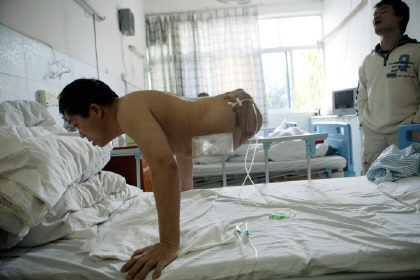 Several operations were carried out and Surgeons sewed up his torso. He spent nearly 2 years in hospital. Peng kept exercising his arms, building up strength.